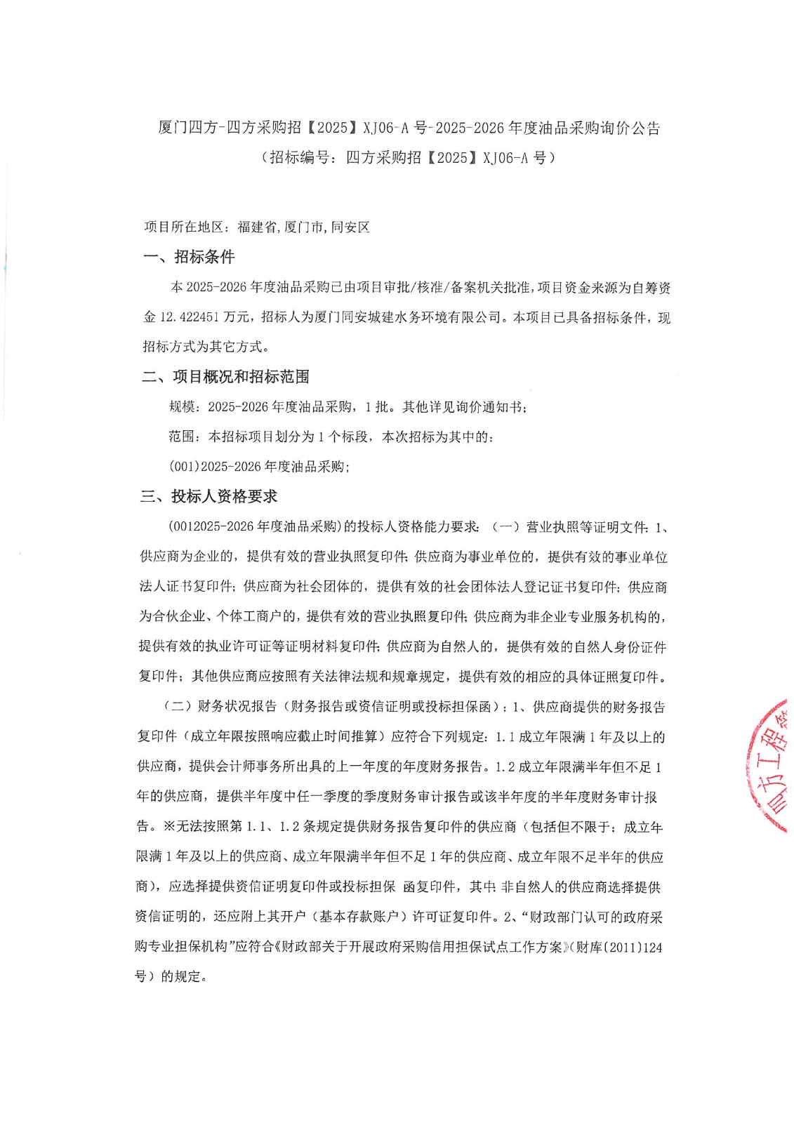 厦门四方-四方采购招【2025】XJ06-A号-2025-2026年度油品采购询价公告