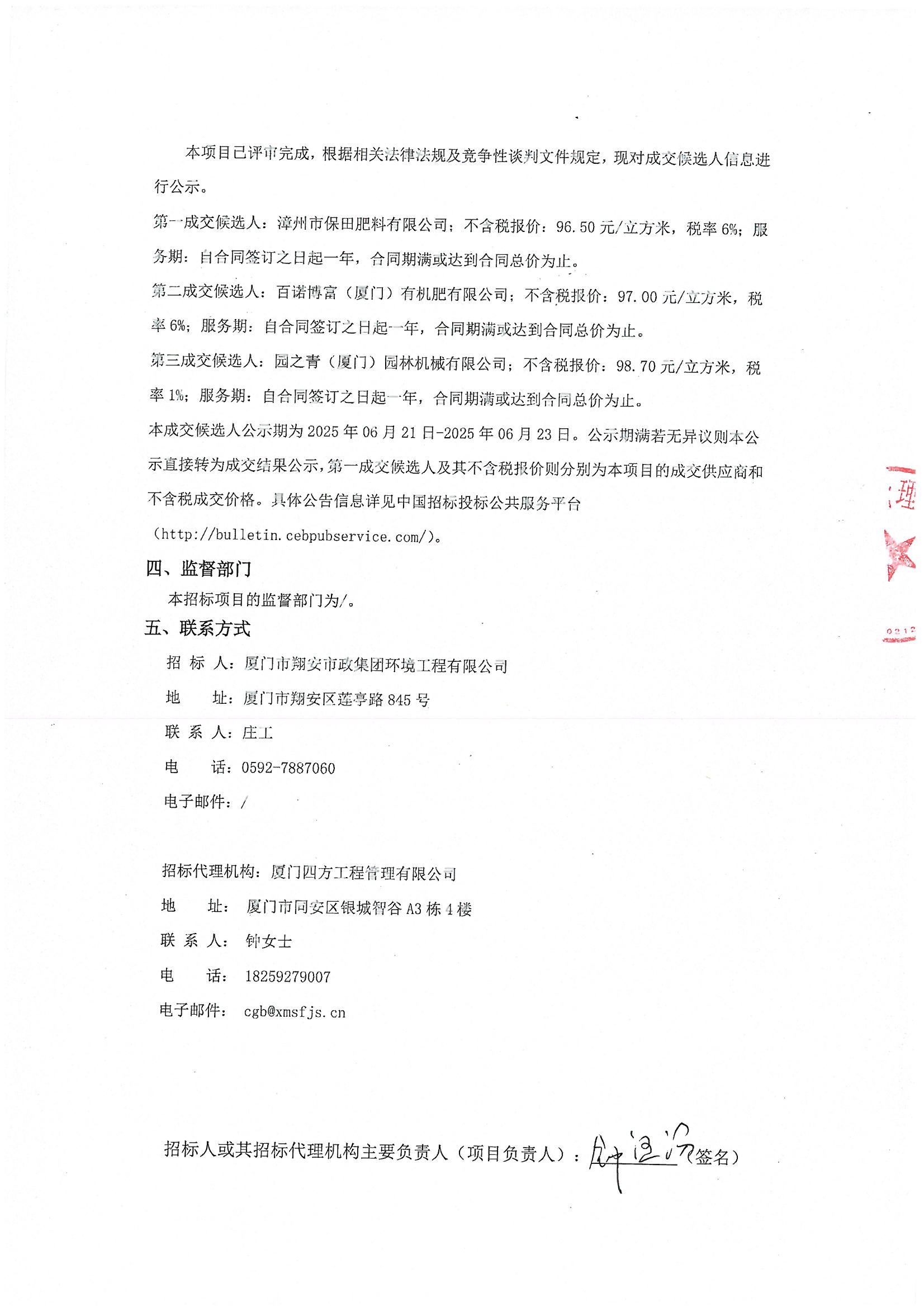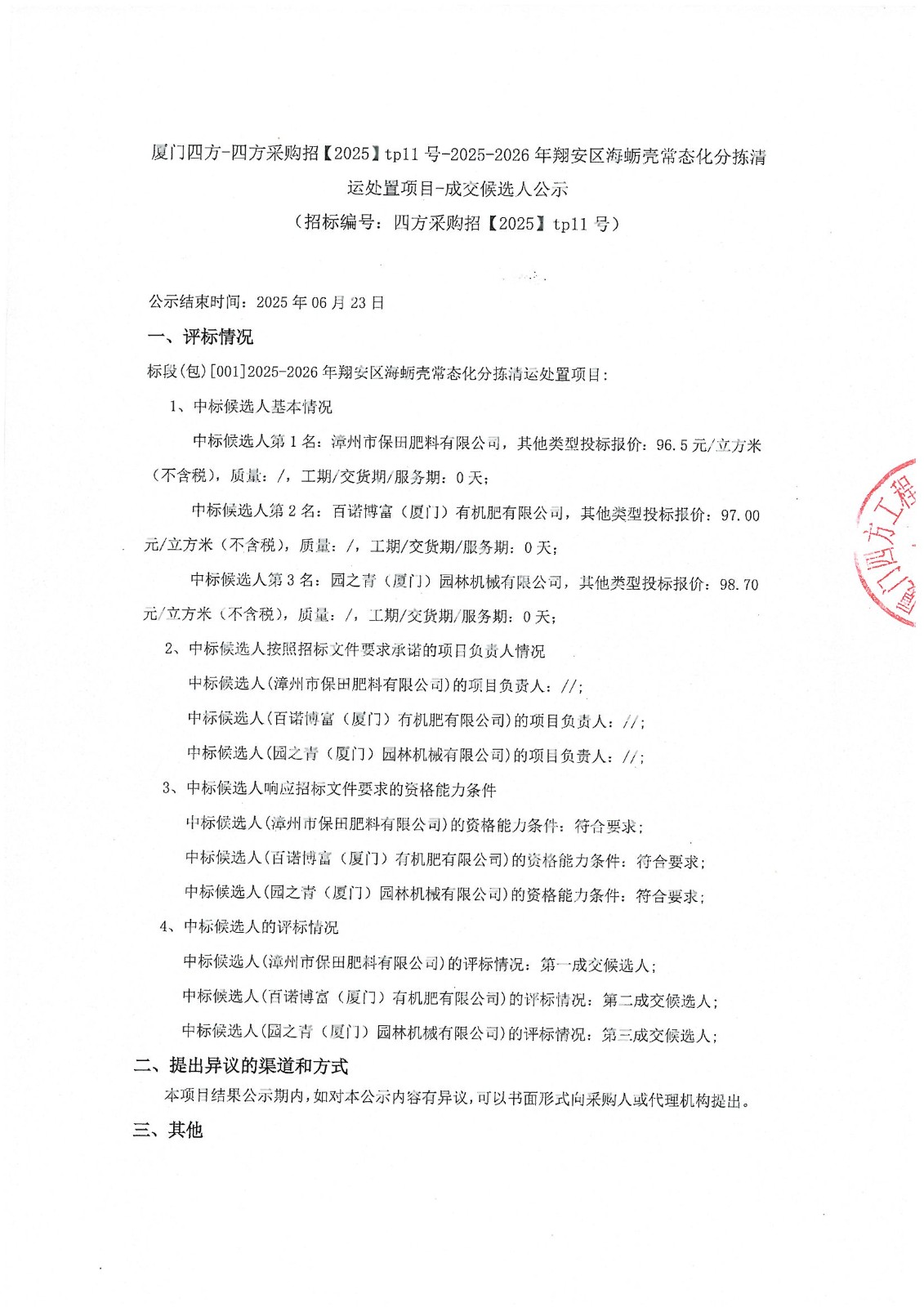 厦门四方-四方采购招【2025】tp11 号-2025-2026 年翔安区海蛎壳常态化分拣清运处置项目-成交候选人公示