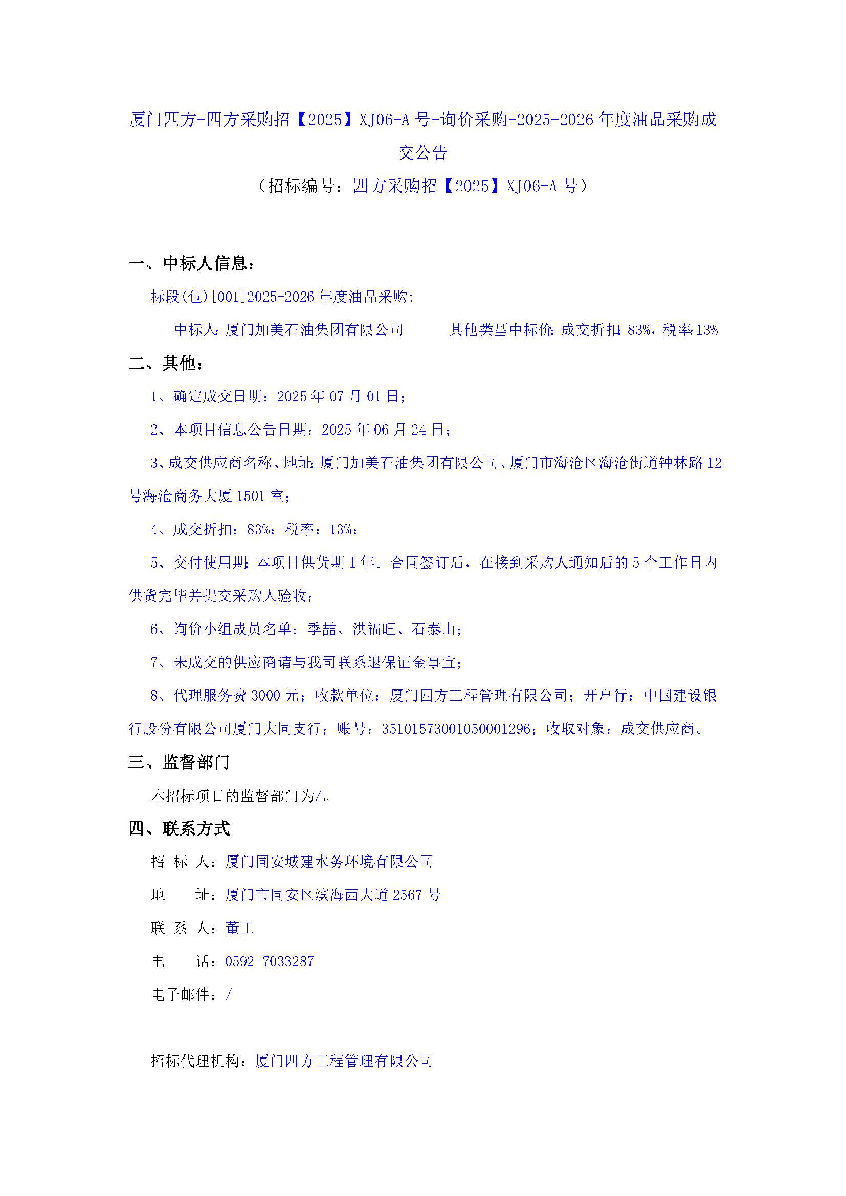 厦门四方-四方采购招【2025】XJ06-A号-询价采购-2025-2026年度油品采购成交公告